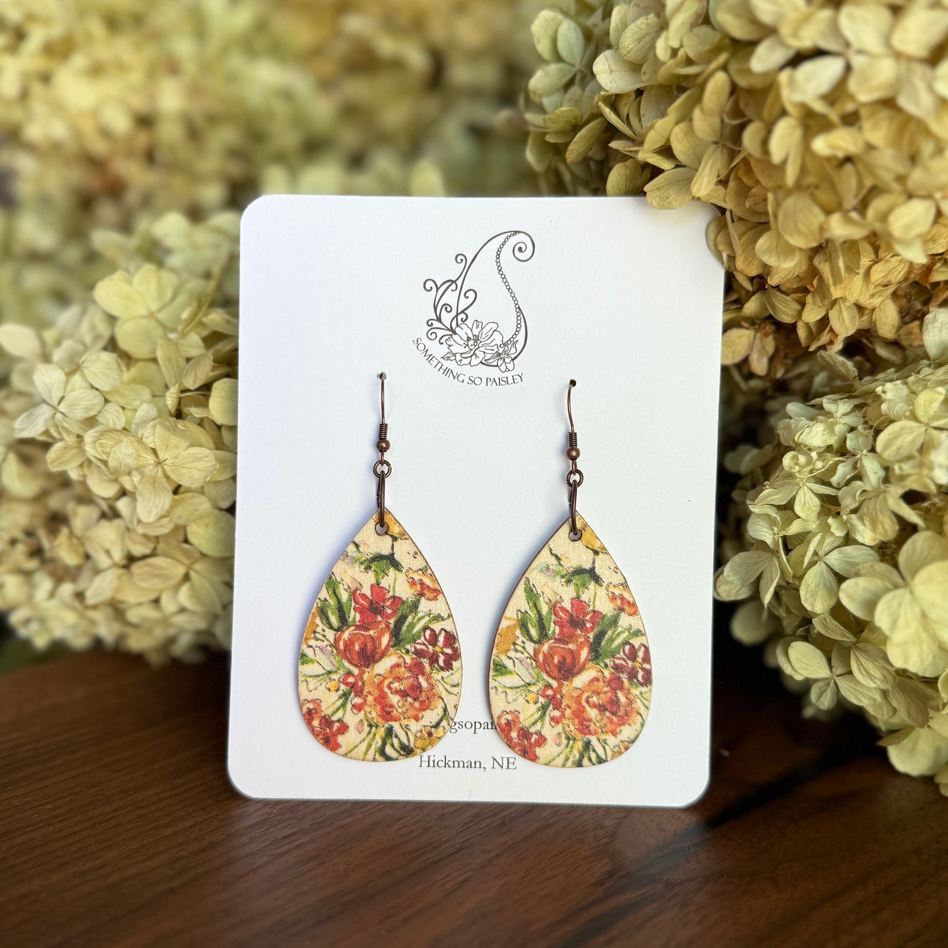 Handcrafted on a lightweight wooden teardrop for comfort all day long. These earrings showcase rich autumn floral hues, perfect to complement your fall wardrobe. They measure approximately 3 1/8" in length and 1 3/8" in width, featuring copper ear wires.