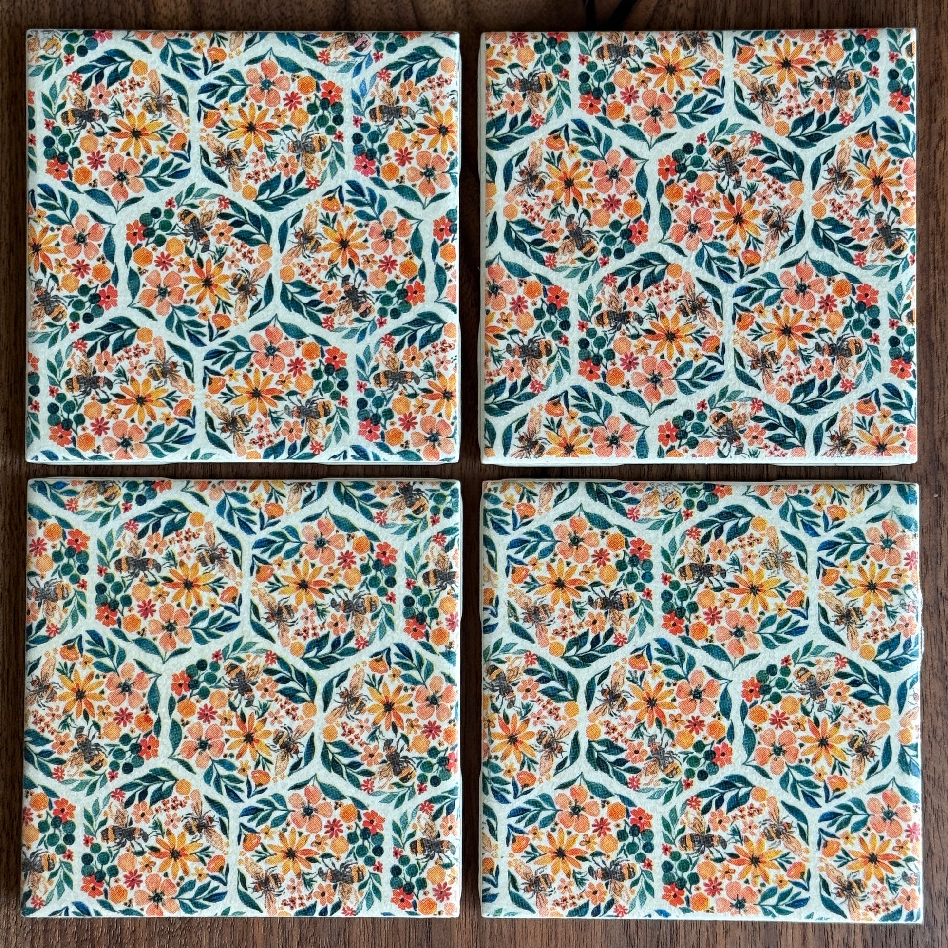 This charming handcrafted set offers four ceramic coasters, each decorated with a playful bees and blossoms motif. Equipped with cork bottoms, they shield your surfaces. They are heat and water resistant. Easy to wipe clean with a damp cloth, these 4 1/4" coasters add a touch of whimsical protection to your table.