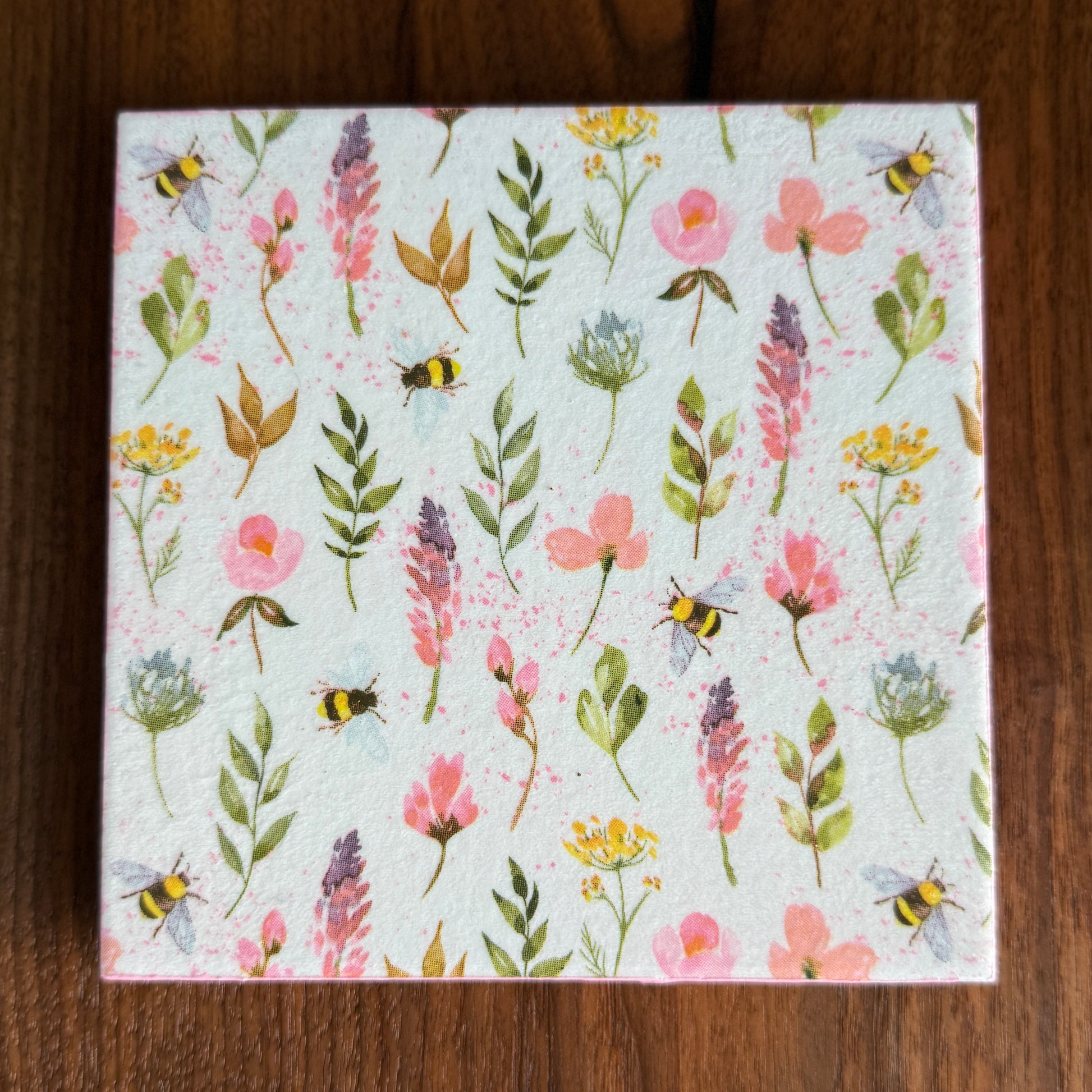 This charming ceramic trivet features a lively mix of wildflowers and buzzing bees in soft pinks, purples, yellows, and blues. Measuring 5 3/4 inches square, it’s lovingly handcrafted to resist heat and moisture. Cleaning is a breeze—simply wipe it down with a damp cloth. Plus, its cork base keeps your surfaces safe and sound.