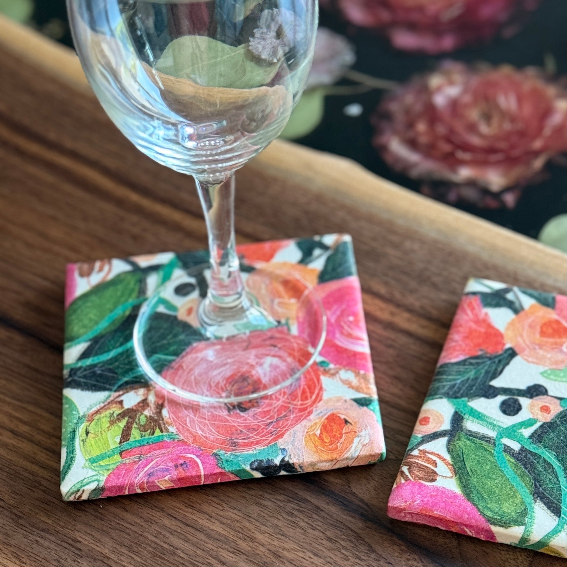 This delightful set of two handcrafted ceramic tile coasters features a whimsical floral pattern in pinks, oranges, and greens against a crisp white background. Each coaster measures 4 1/4" square and is designed to resist heat and moisture. Easily clean them with a damp cloth—avoid soaking. With cork backing, these coasters guard your surfaces while adding a touch of whimsy to your space.