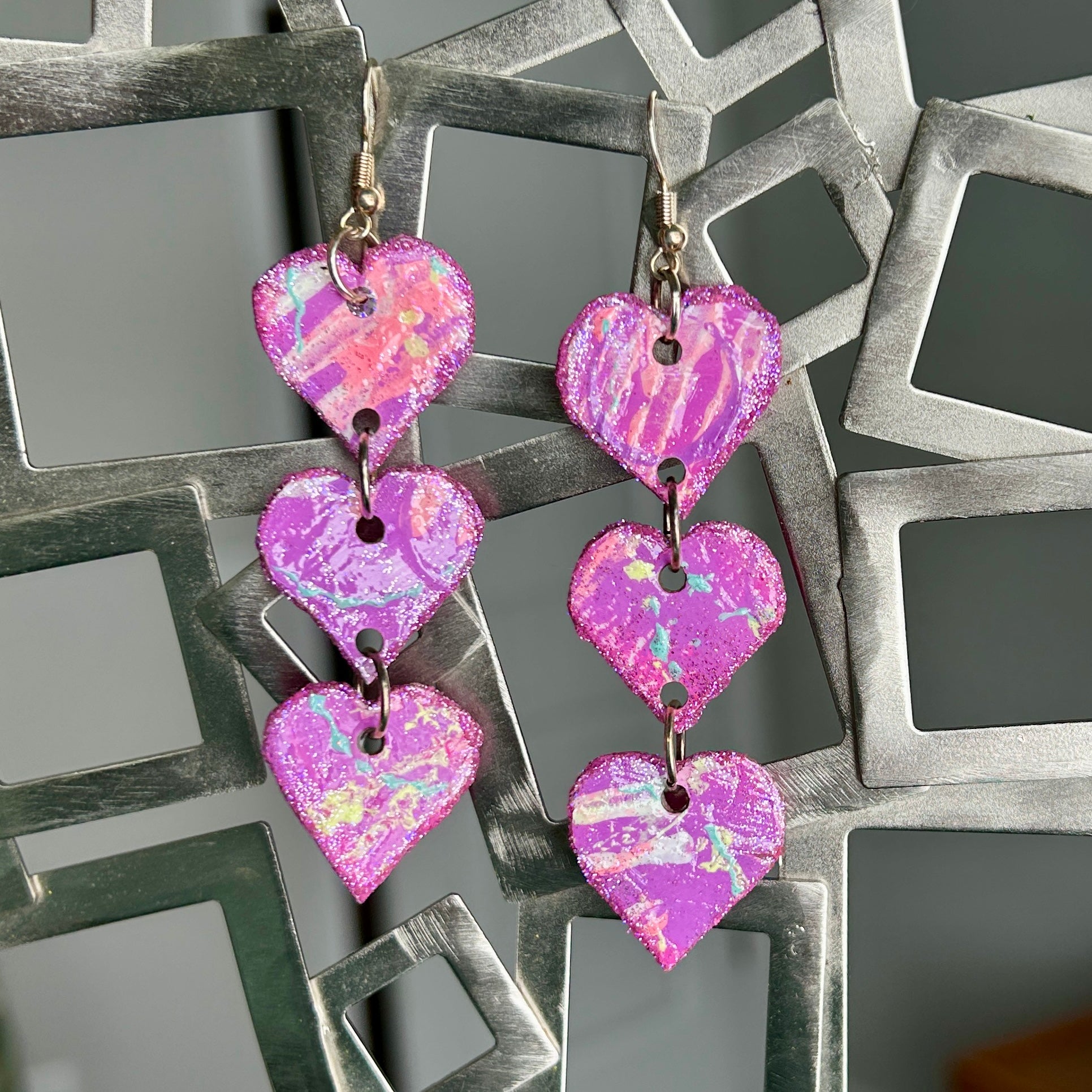 These whimsical earrings feature three tiny hearts handcrafted from lightweight recycled paper, each hand-painted and adorned with sparkling lavender glitter. Linked together, they dangle gracefully from silver ear wires, measuring approximately 3 1/2" in length and 1" in width.