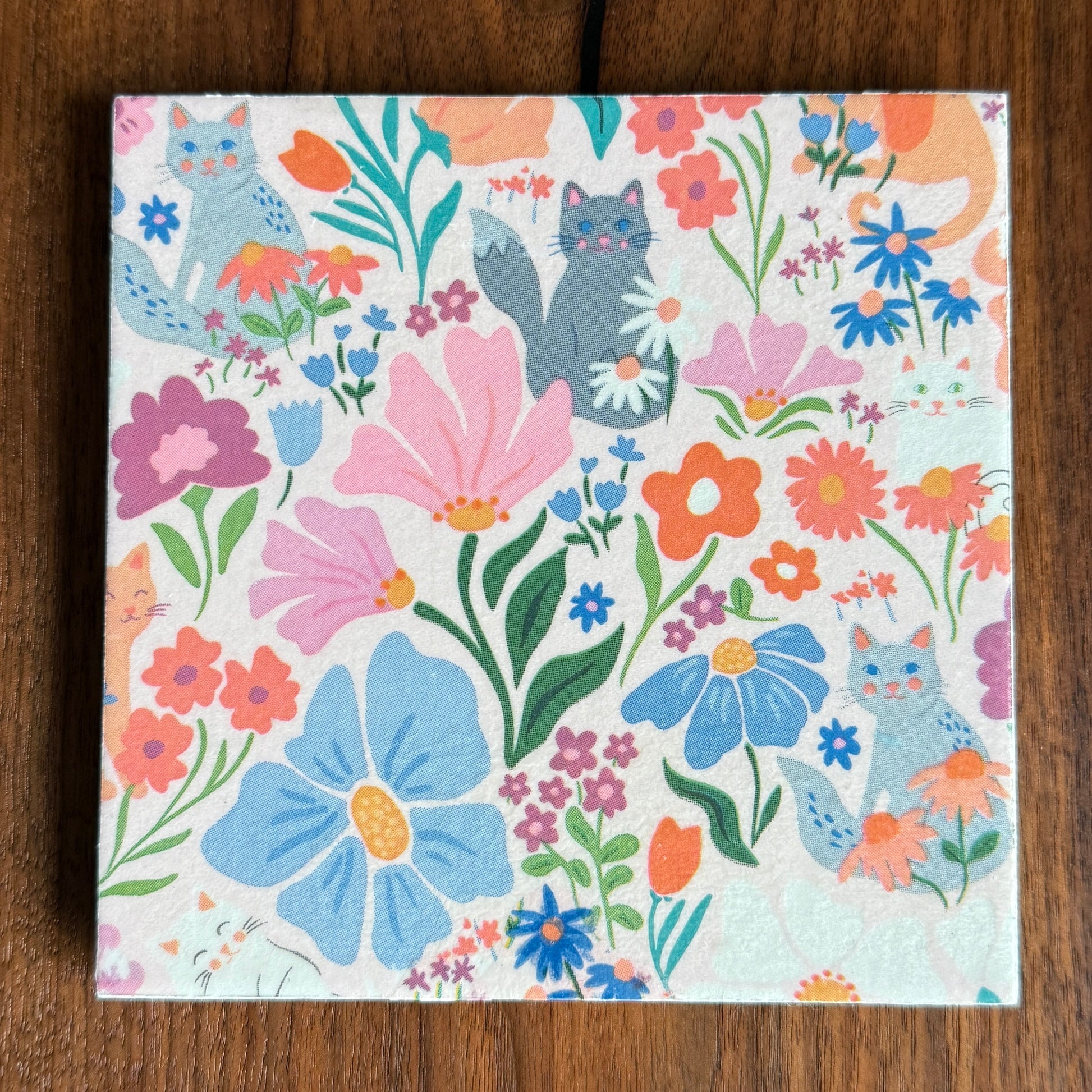 This charming ceramic trivet brings together two delightful things: adorable felines and blooming botanicals. Measuring 5 3/4" square, each piece is handcrafted with playful cat designs nestled among whimsical florals. The heat and water-resistant surface keeps your table safe from hot dishes and spills, while the cork backing prevents scratches on your furniture. Purr-fect for the cat enthusiast who appreciates functional art with personality.