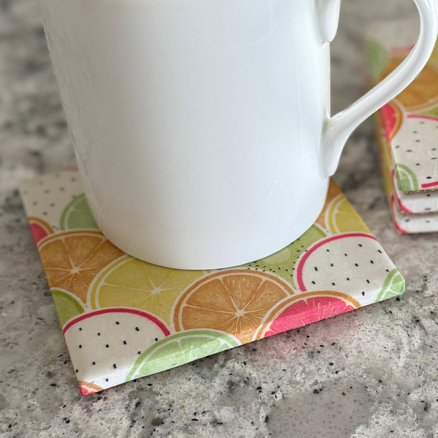 This playful set brings you four handcrafted ceramic tile coasters, each decorated with colorful sliced fruit patterns in white, orange, pink, green, and yellow. Their cork-backed design keeps your surfaces safe from scratches. These coasters are heat and water resistant.To clean just wipe with a damp cloth-no soaking. At 4 1/4" each, they add a fun and protective touch to any tabletop.