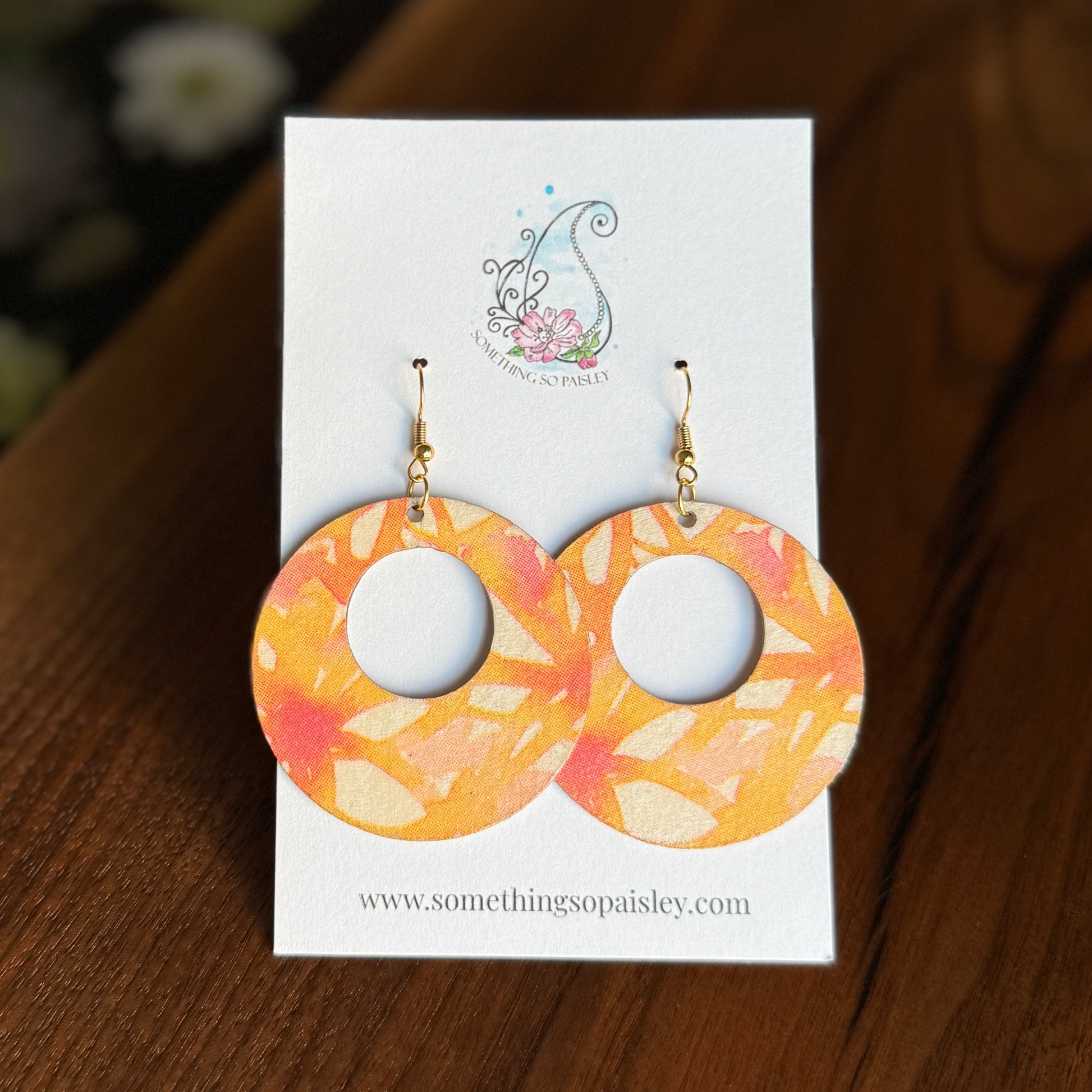 Handcrafted on a circular wooden base, these cheerful yellow and pink abstract earrings radiate a warm, sunlit charm. They measure about 2 3/4'" in length and 2" across, gently swaying from gold ear wires.